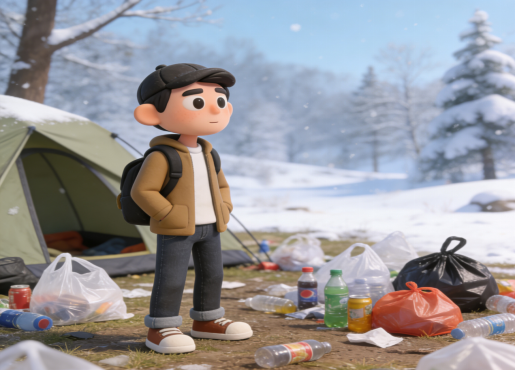 郊外露营地遗留塑料袋、饮料瓶等垃圾,污染自然环境,与冬日雪景格格不入。