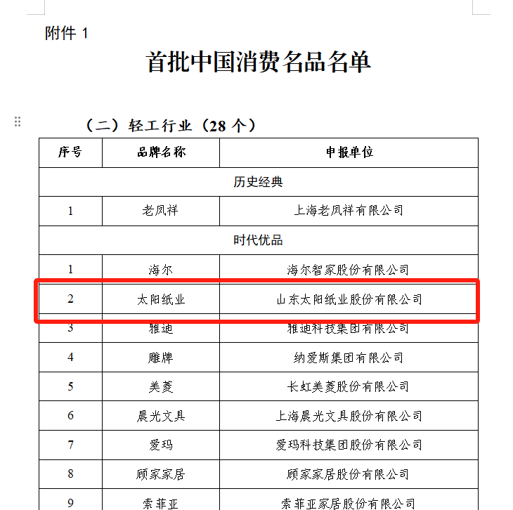 【区工信局】全市唯一!太阳纸业入选工信部首批“中国消费名品”名单