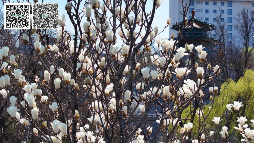 园内存有树龄数十年的玉兰树,集中种植于秋水湖东园路两侧,枝干遒劲,成片盛放时如云似雪,花瓣晶莹剔透,与古典亭台、石径、湖面相映成趣,营造出古典园林的诗画氛围。