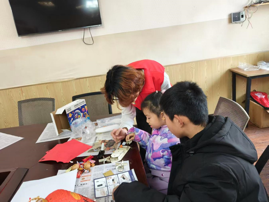 剪纸区里,志愿者手把手教小朋友折叠彩纸、握剪造型,耐心讲解每一个步骤。木质拼装区成为孩子们的“创意实验室”。志愿者弯着腰,用手指着拼装图纸,轻声讲解组装技巧。在志愿者的引导下,原本零散的木块逐渐变成精致的小摆件,孩子们捧着自己的作品,成就感满满。红灯笼制作将活动推向高潮。志愿者们分发印有“大吉大利”的灯笼套件,带领孩子们组装框架、粘贴装饰、系挂流苏。在志愿者的帮助下,一盏红彤彤的灯笼很快成型,孩子拿着自己制作的红灯笼脸上笑开了花。