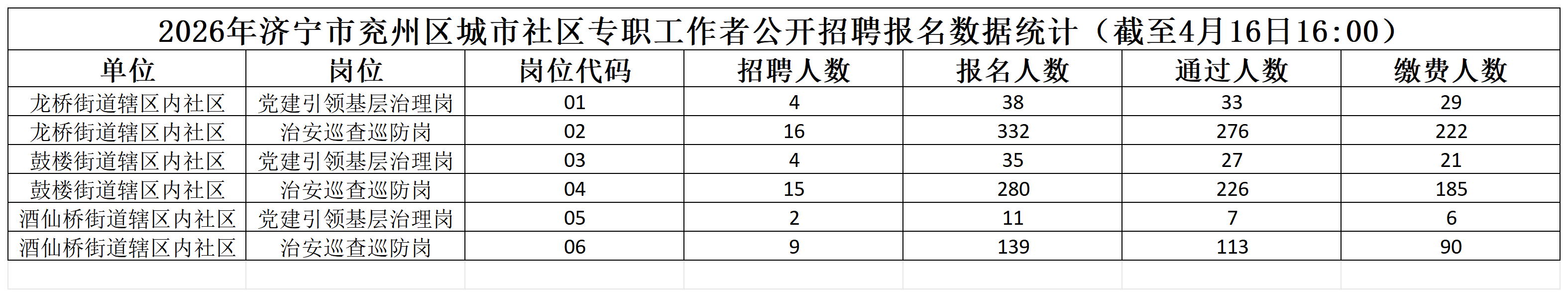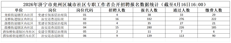 2026年济宁市兖州区城市社区专职工作者公开招聘报名数据统计(截至4月16日16:00)