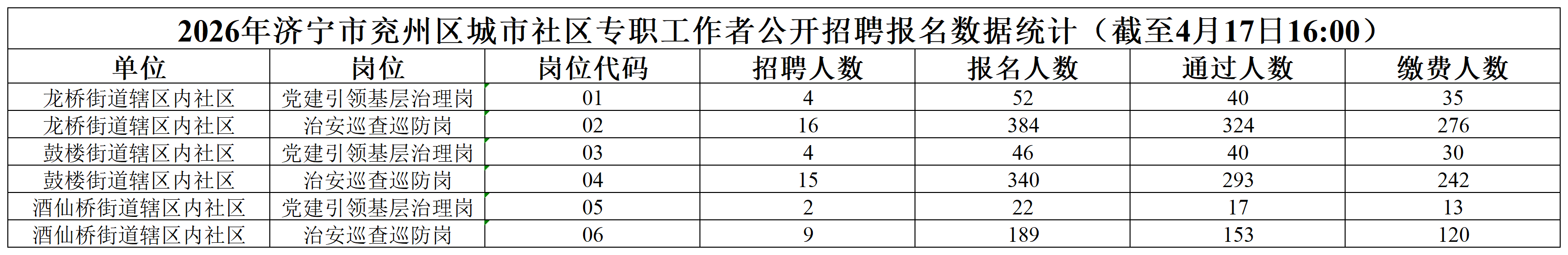 2026年济宁市兖州区城市社区专职工作者公开招聘报名数据统计(截至4月17日16:00)