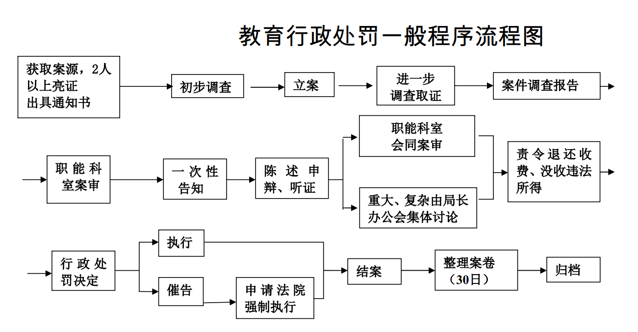 | 调查取证并发出教育行政处罚告知书 | 制作调查询问笔录,执法人员不少于2人,调查取证,提出处理意见。 | 60个工作日 | 如果存在违法行为,发出教育行政处罚告知书。 |