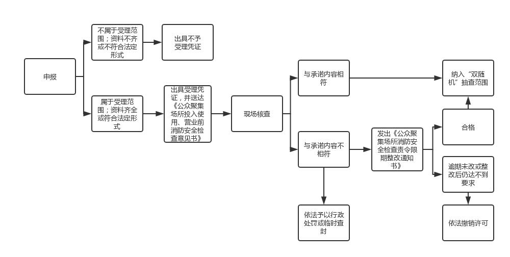 | 办结 | 对符合条件的,颁发《公众聚集场所投入使用、营业前消防安全检查意见书》;对不符合条件的,出具《不予受理凭证》,申请人享有依法申请行政复议或者提起行政诉讼的权利。 | 即时办结 | 作出许可决定 |