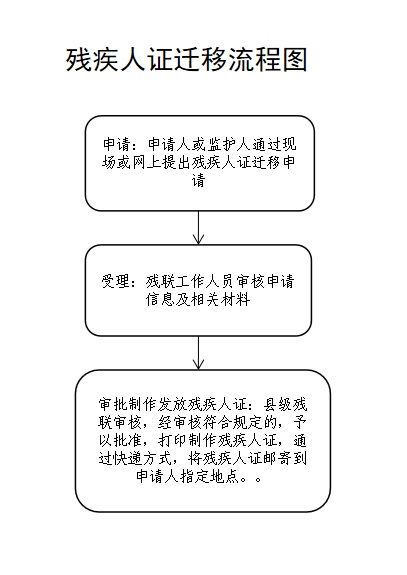 | 审批制作发放残疾人证 | 县级残联审核,经审核符合规定的,予以批准,打印制作残疾人证。 | 根据各县(市、区)残联实际情况确定办理时限。 | 县级残联打印制作残疾人证后,通过原受理渠道或者邮递等便捷方式,将残疾人证发放至申请人。 |