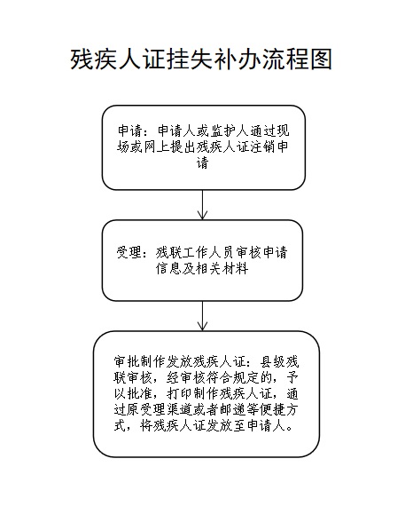 | 审批制作发放残疾人证 | 县级残联审核,经审核符合规定的,予以批准,打印制作残疾人证。 | 根据各县(市、区)残联实际情况确定办理时限。 | 县级残联打印制作残疾人证,通过原受理渠道或者邮递等便捷方式,将残疾人证发放至申请人。 |